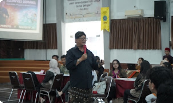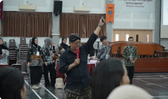 Bagi dosenblankon, belajar kepemimpinan tidak harus selalu kaku. Ia membuka sesi dengan cara yang tidak biasa: bernyanyi bersama peserta. Suara tawa dan semangat mahasiswa pun mengisi ruangan. Menurutnya, suasana gembira membuat pikiran lebih terbuka untuk menerima gagasan.