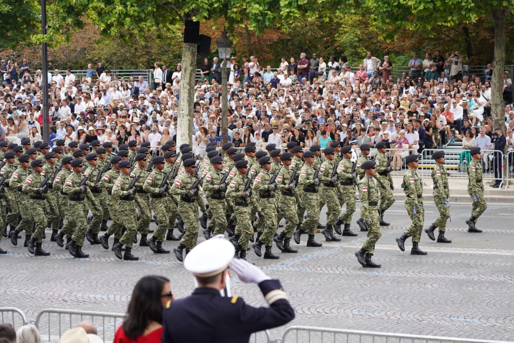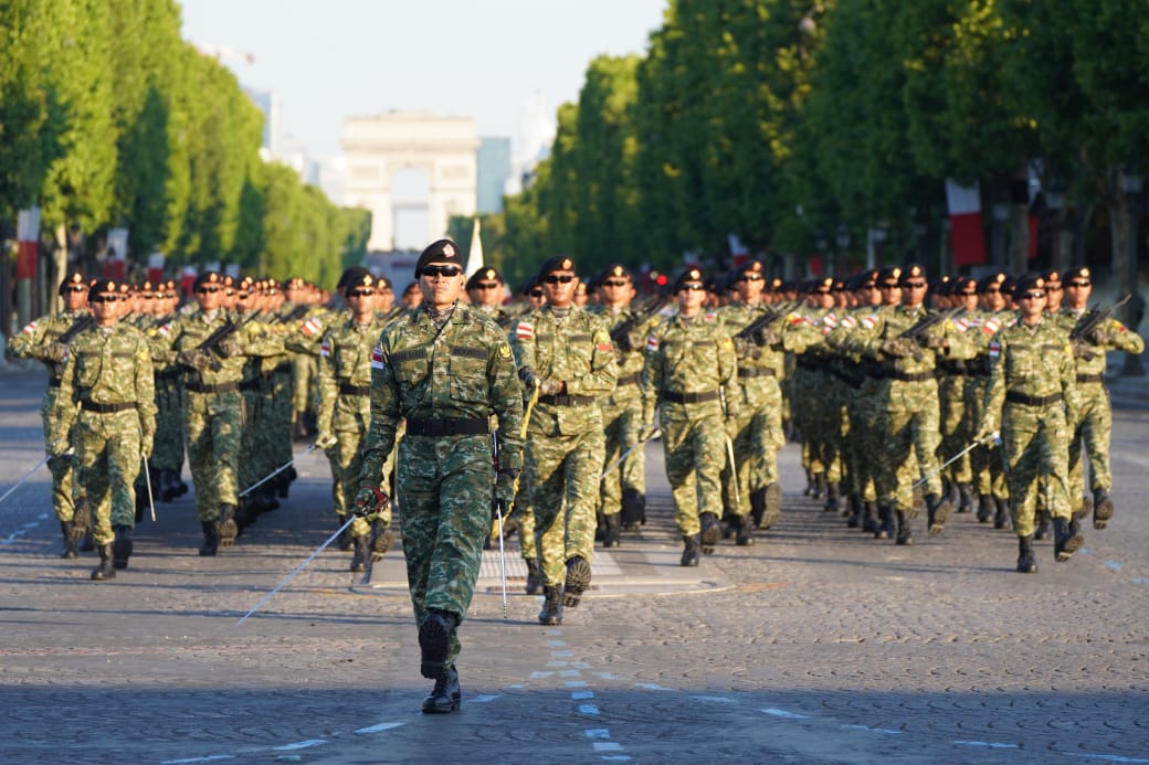 Derap langkah tegap diiringi irama langkah yang kompak dan penuh semangat, pasukan TNI berhasil menarik perhatian ribuan warga Paris yang tumpah ruah memadati sisi jalan, serta disambut tepuk tangan meriah dari para tamu kehormatan dan masyarakat internasional yang hadir pada peringatan Hari Nasional Prancis (Bastille Day) bertempat di Champs-Élysées, Paris, Senin (14/7/2025).