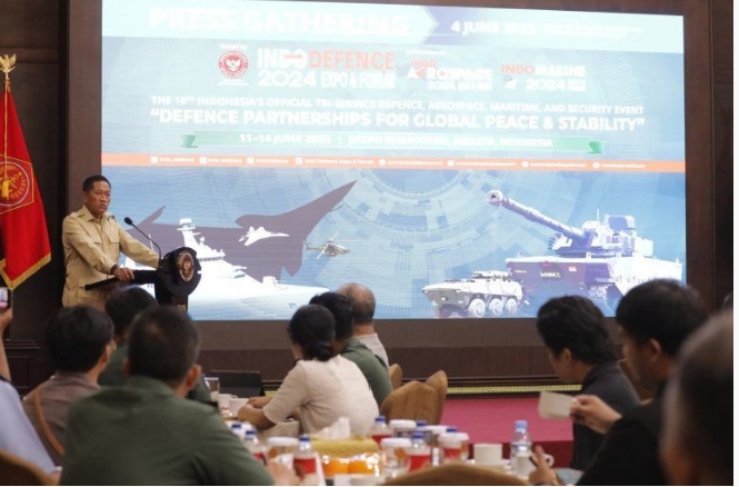 Kementerian Pertahanan Republik Indonesia (Kemhan RI) menggelar Press Gathering dalam rangka Indo Defence 2024 Expo & Forum di Kementerian Pertahanan Jakarta.